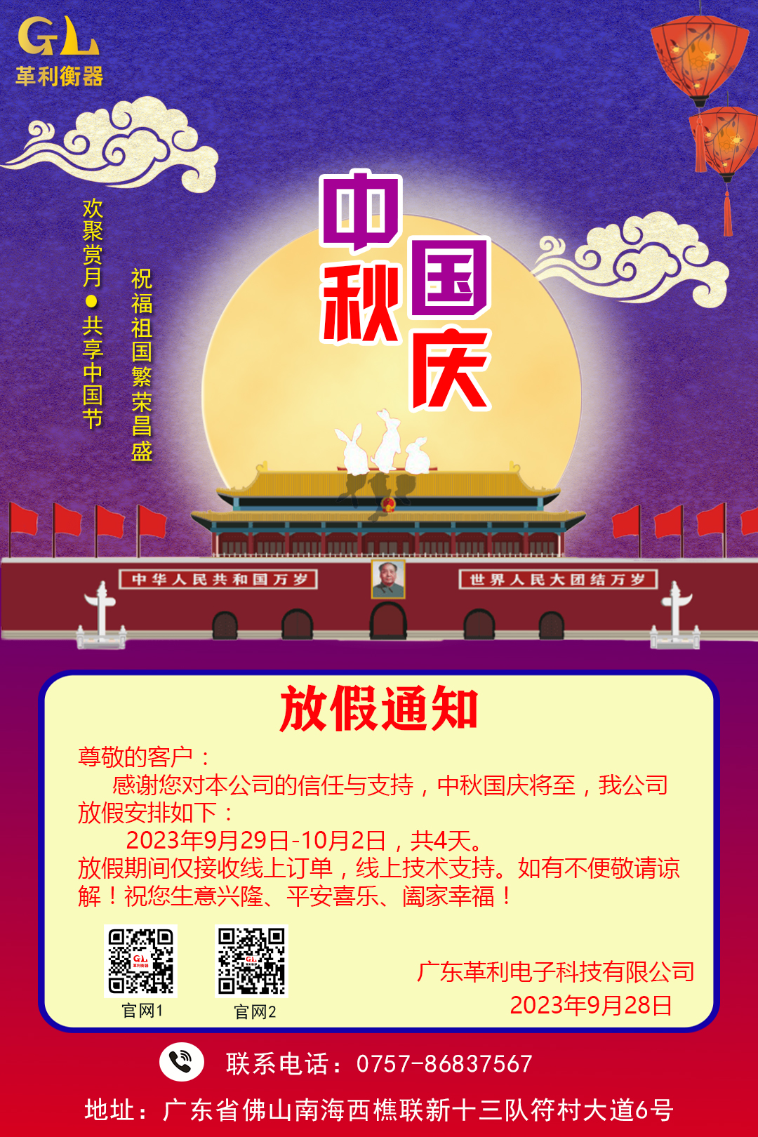 2023年革利衡器公司中秋節(jié)、國慶節(jié)放假通知:9月29日-10月2日,共4天。10月3日上班。