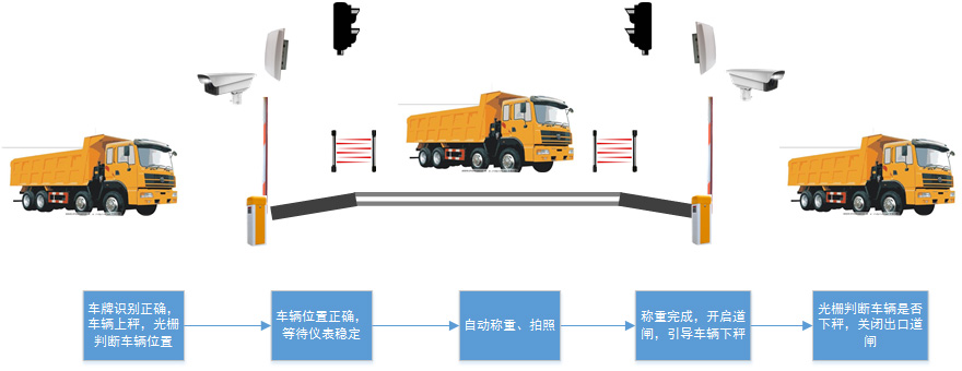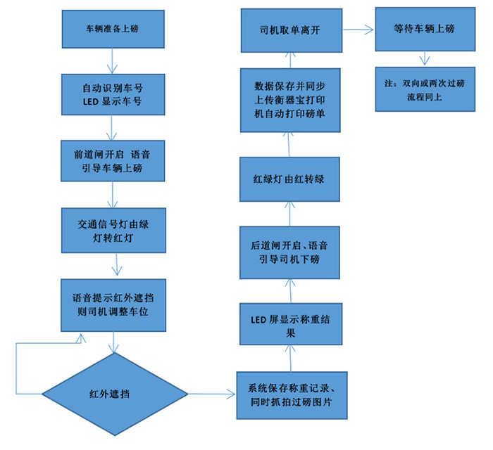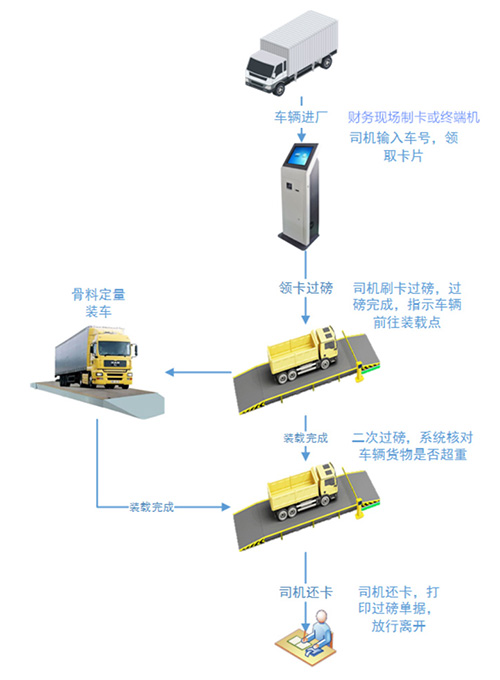 司機(jī)進(jìn)入料倉(cāng)位置、車號(hào)識(shí)別儀自動(dòng)識(shí)別車號(hào)、車牌號(hào)碼自動(dòng)輸入計(jì)算機(jī)司機(jī)刷卡比對(duì)料口位置是否正確,正確電腦則提示改車預(yù)制裝貨信息及預(yù)裝量、操作人員待車輛停穩(wěn)后保存車輛皮重后選擇開始放料,待重量快到預(yù)裝量時(shí)閥門則逐步開始減少放料、直到完全關(guān)閉,閥門完全關(guān)閉后待重量穩(wěn)定操作員選擇保存總重。語音提示裝料完畢、請(qǐng)司機(jī)離開。司機(jī)拿過磅單后下磅離開。