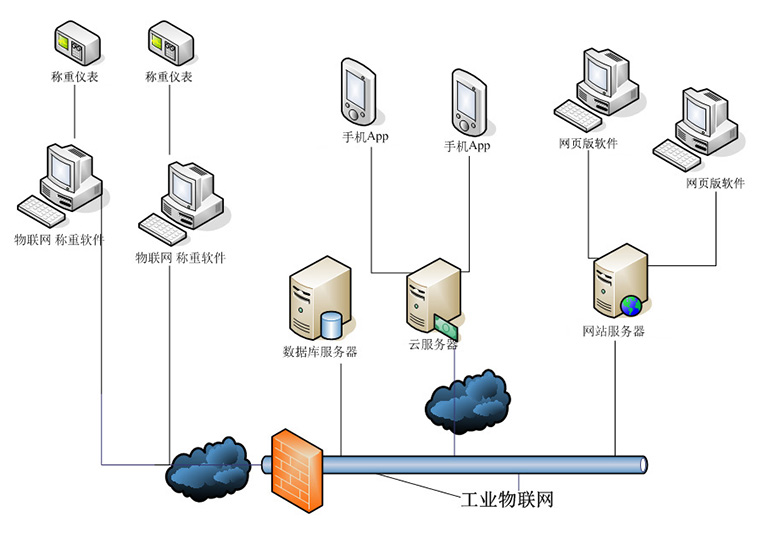物聯(lián)網(wǎng)稱重系統(tǒng),由稱重硬件設(shè)備、電腦稱重系統(tǒng)、數(shù)據(jù)庫(kù)服務(wù)器、云服務(wù)器、電腦網(wǎng)站系統(tǒng)、手機(jī)app軟件等幾部分組成。